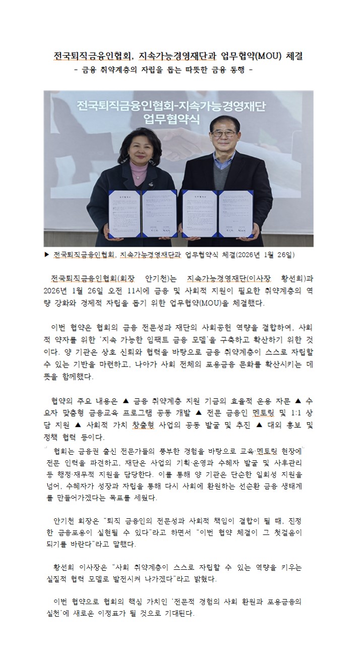 전국퇴직금융인협회, 지속가능경영재단과 업무협약(MOU) 체결