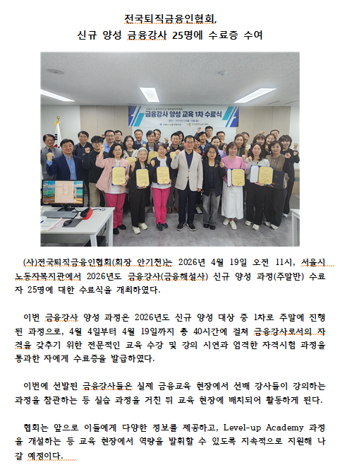 전국퇴직금융인협회, 신규 양성 금융강사 25명에 수료증 수여