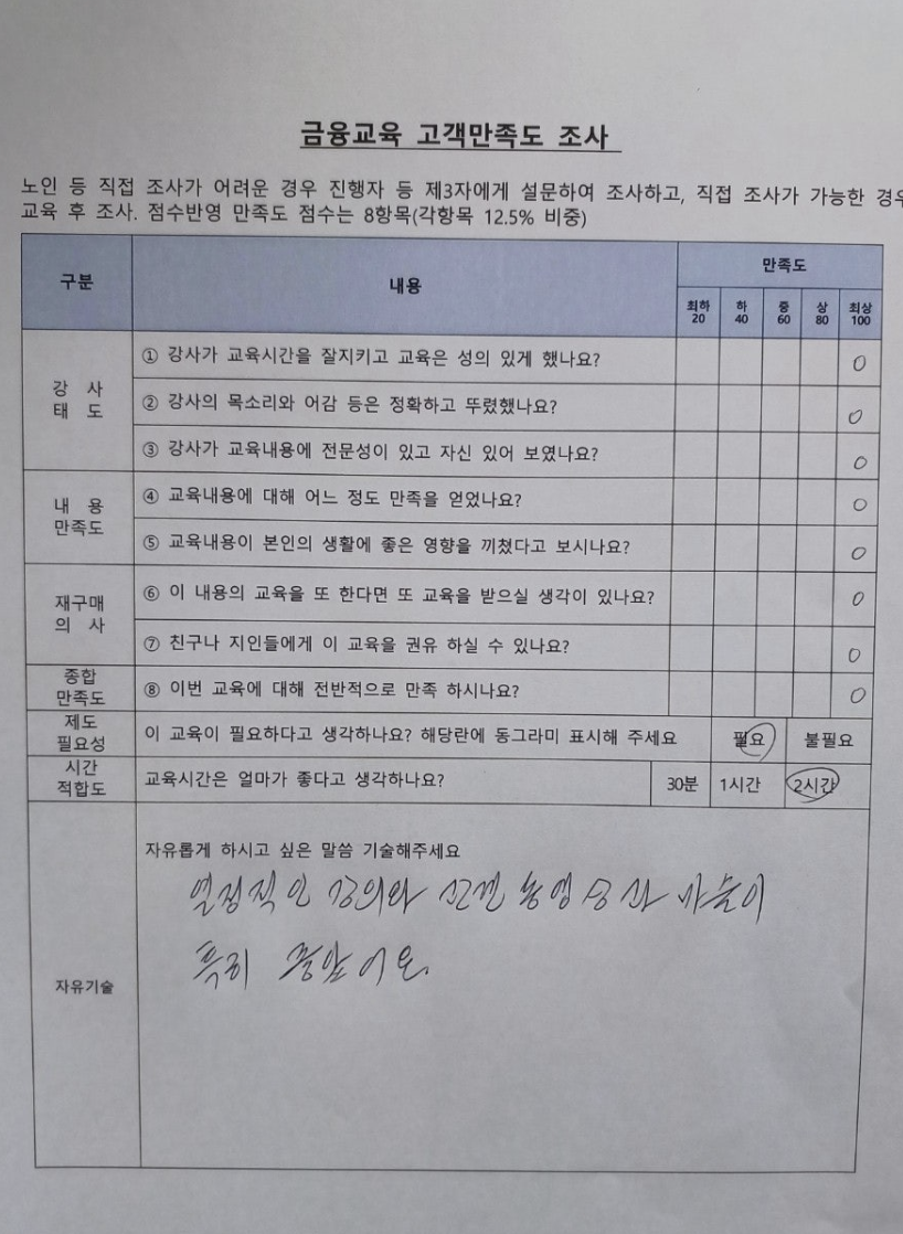 | 교육내용 | -. 가계부를 사용해야 하는이유 (낭비요소를 체크할 수가 있다) -. 선 저축 후 지출해야 하는 이유 (습관이 답이다) -. 신용카드관리로 소비지출 자제법 (카드사용시 어떠한 생각을 하나요?) -. 사람이 급할수록 보이스피싱에 노출될 확율이 높다. -. 신용회복지원절차 (신용회복위원회와 법원 절차) -. 평생직업을 찾는 방법 (자기 탐색) -. 고수익상품은 고 리스크 (검소한 습관 만들기와 평생 현역이 답이다) |