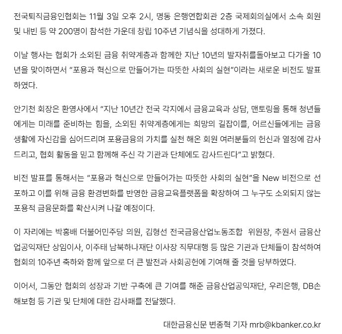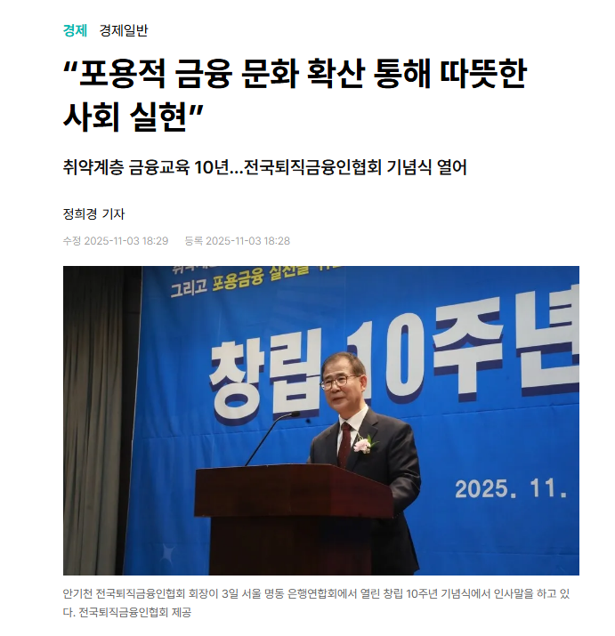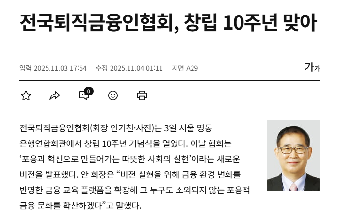 [한국경제] 전국퇴직금융인협회 , 청소년,취약층에 금융교육 ... 1 대 1 맞춤 상담 _2025.11...